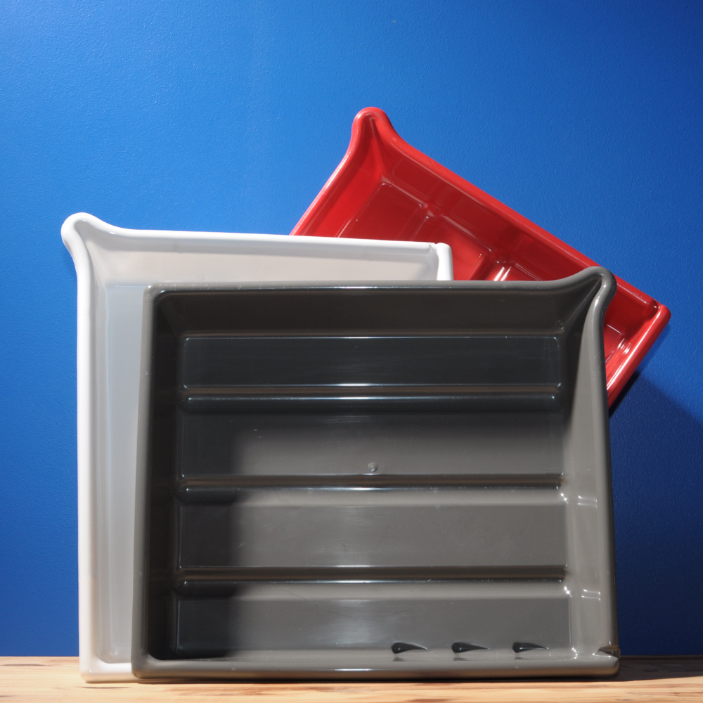 Cuvettes de développement en polypropylène épais, conçus avec des nervure permettant une meilleure stabilité ; également des encoches sur le coté permette de faire tenir un thermomètre, disponible en trois couleurs : rouge, blanche et grise.